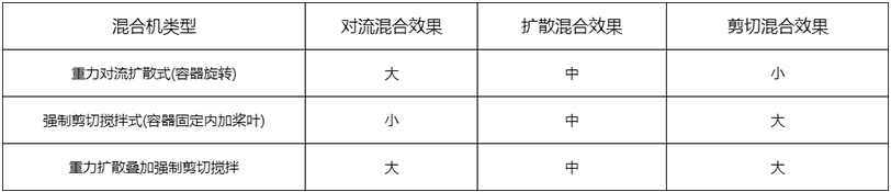 上述三種混合作用是不能決然分開的,各種混合機(jī)都是以上述三種作用的某一種作用起主導(dǎo)作用。各種混合設(shè)備由于結(jié)構(gòu)不同,混合效果有顯著差別(見下表)。