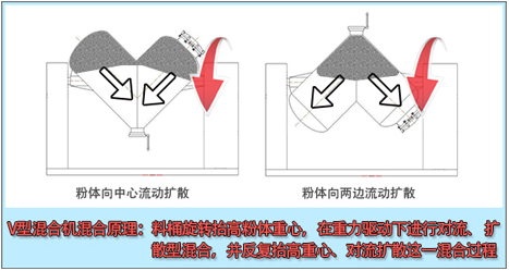 通過機(jī)械力不斷抬高粉體重心,利用重力迫使粉體反復(fù)向下進(jìn)行流動(dòng)、擴(kuò)散、對(duì)沖、折疊等運(yùn)動(dòng)的混合方法。其作用是宏觀上使粉體之間相互摻和、滲透,從而達(dá)到混合均勻的目的。代表機(jī)型:V型混合機(jī)、三維混合機(jī)、雙錐機(jī)等。