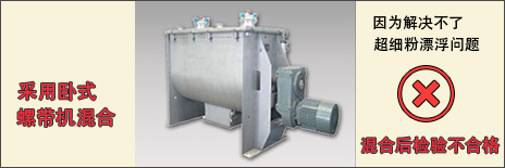混合一個小時,混合結果檢驗不均勻。分析原因:臥式螺帶混合機屬于運動槳葉強制剪切型混合機,混合過程中超細粉、微粉被運動槳葉攪拌時,因粒徑太小太輕極易漂浮在料桶中的物料上方,使混合均勻的問題難以達到。