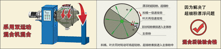 針對超細粉、微米粉、納米粉的上述兩個特點,漂浮性和數量劇增性,要求混合機能夠克服這兩種特性,并達到均勻混合的目的。
