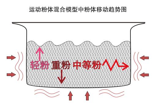 定義:在外力的作用下容器內(nèi)的粉體發(fā)生激烈運動,在運動粉體中粉體顆粒之間相互摻和混合的過程中出現(xiàn)了液態(tài)化特征,即粉體顆粒因自身的因素會在主體粉中出現(xiàn)“上浮”、“下沉”、“懸浮”現(xiàn)象。這種粉體的運動模式就是運動粉體液態(tài)化混合模型如下圖。