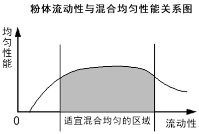 3)在實際工作中,流動性太好或太差粉體的混合其實都是混合工藝難題,(混合均勻與流動性的關系如下圖)需要有性能強大的混合設備來解決。