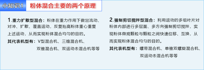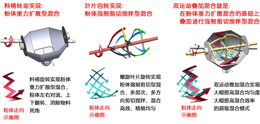 其混合性能各有顯著缺陷(如:重力擴(kuò)散型混合機(jī)代表機(jī)型V型機(jī)、三維機(jī),缺點(diǎn)是粉體微觀處缺乏充分剪切、位移,混合效率低;強(qiáng)制剪切型混合機(jī)代表機(jī)型螺帶混合機(jī)、單錐混合機(jī),缺點(diǎn)是有物料死角,粉體宏觀移動(dòng)速度慢)。