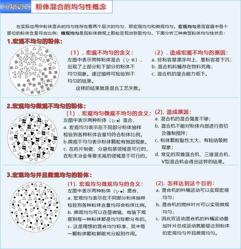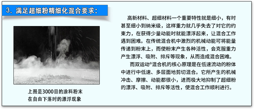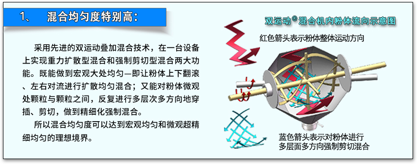 采用先進(jìn)的雙運(yùn)動(dòng)疊加混合技術(shù),在一臺(tái)設(shè)備上實(shí)現(xiàn)重力擴(kuò)散型混合和強(qiáng)制剪切型混合兩大功能。既能做到宏觀大處均勻—即讓粉體上下翻滾、左右對(duì)流進(jìn)行擴(kuò)散均勻混合;又能對(duì)粉體微觀處顆粒與顆粒之間,反復(fù)進(jìn)行多層次多方向地穿插、剪切,做到精細(xì)化強(qiáng)制混合。所以混合均勻度可以達(dá)到宏觀均勻和微觀超精細(xì)均勻的理想境界。