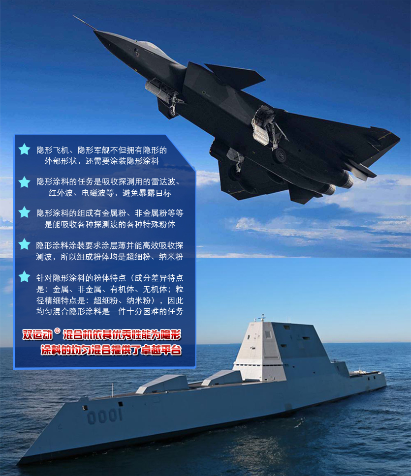 國家重器隱形飛機(jī)的隱形涂料和高新材料發(fā)展都需要雙運(yùn)動(dòng)?混合機(jī)來擔(dān)當(dāng)混合重任