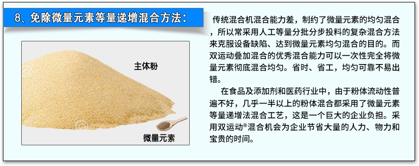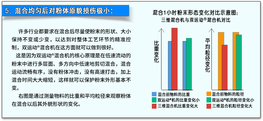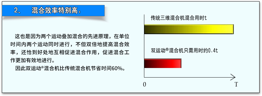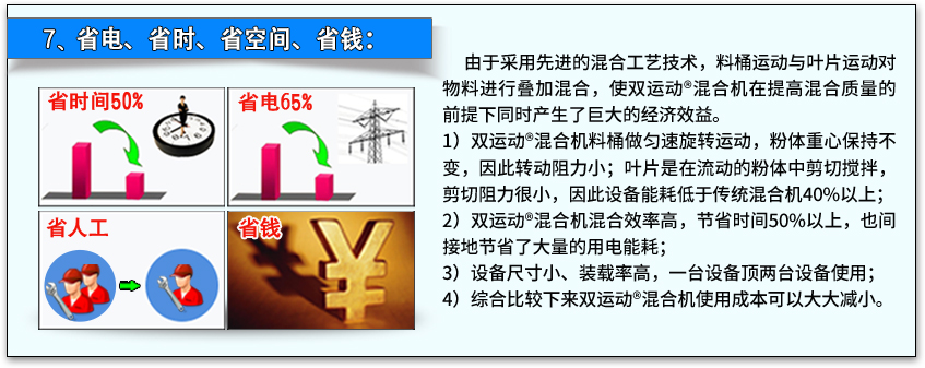 這也是因?yàn)閮蓚€(gè)運(yùn)動(dòng)疊加混合的先進(jìn)原理,在單位時(shí)間內(nèi)兩個(gè)運(yùn)動(dòng)同時(shí)進(jìn)行,不但雙倍地提高混合效率,還恰到好處地互相促進(jìn)混合作用,促進(jìn)混合工作更加有效地進(jìn)行。因此雙運(yùn)動(dòng)混合機(jī)比傳統(tǒng)混合機(jī)節(jié)省時(shí)間60%。