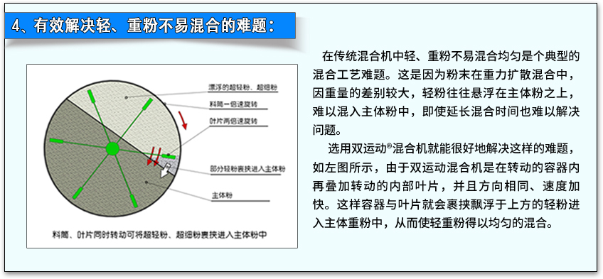 我們的設(shè)計(jì)團(tuán)隊(duì)針對(duì)上述問題榮譽(yù)研發(fā)出雙運(yùn)動(dòng)混合機(jī),其問世很好地解決了傳統(tǒng)混合機(jī)存在的各種缺點(diǎn)。雙運(yùn)動(dòng)混合機(jī)開創(chuàng)了全新的混合理念,大幅度提高混合效率!!!