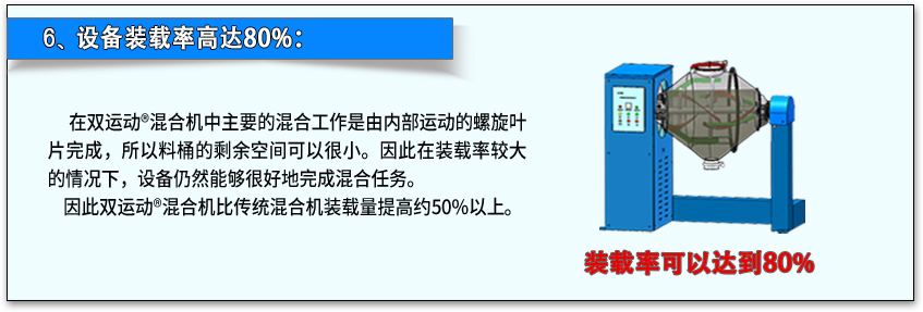在雙運(yùn)動(dòng)混合機(jī)中主要的混合工作是由內(nèi)部運(yùn)動(dòng)的螺旋葉片完成,所以料桶的剩余空間可以很小。因此在裝載率較大的情況下,設(shè)備仍然能夠很好地完成混合任務(wù)。因此雙運(yùn)動(dòng)?混合機(jī)比傳統(tǒng)混合機(jī)裝載量提高約50%以上。