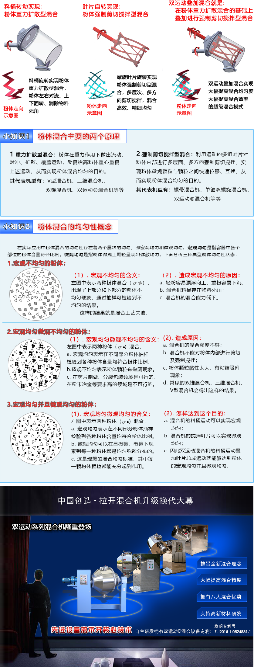 采用先進的雙運動疊加混合技術,在一臺設備上實現重力擴散型混合和強制剪切型混合兩大功能。既能做到宏觀大處均勻—即讓粉體上下翻滾、左右對流進行擴散均勻混合;又能對粉體微觀處顆粒與顆粒之間,反復進行多層次多方向地穿插、剪切,做到精細化強制混合。所以混合均勻度可以達到宏觀均勻和微觀超精細均勻的理想境界。