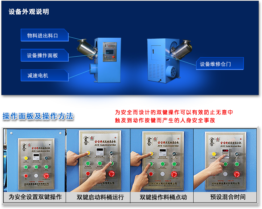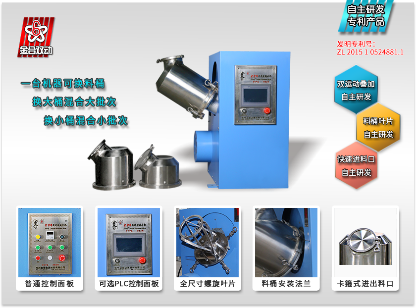 針對許多 客戶待混合物料批量或多或少,通常解決辦法是購置大小多款機器來滿足這些混合要求,因此,增加了很多采購費用。有沒有更好的解決辦法呢?針對這個問題我們研發出了雙運動可換桶機型,很好地解決了這個難題。