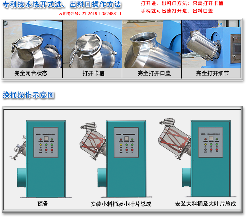 可換桶機型的研發目的就是要在一臺機器上根據物料的多少更換上相適應的大小不同的料桶,從而以低成本、巧妙的方法解決了這一難題。