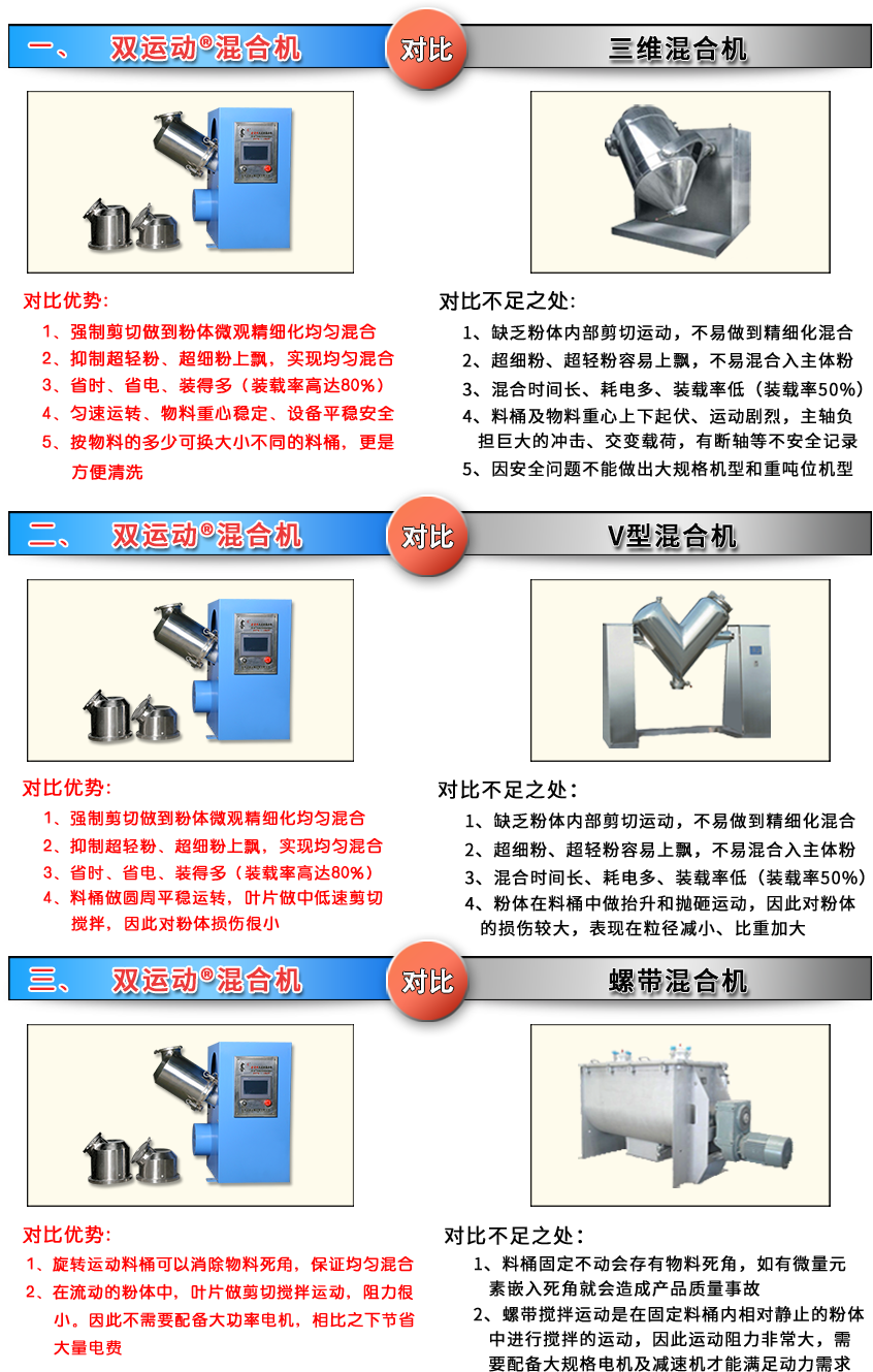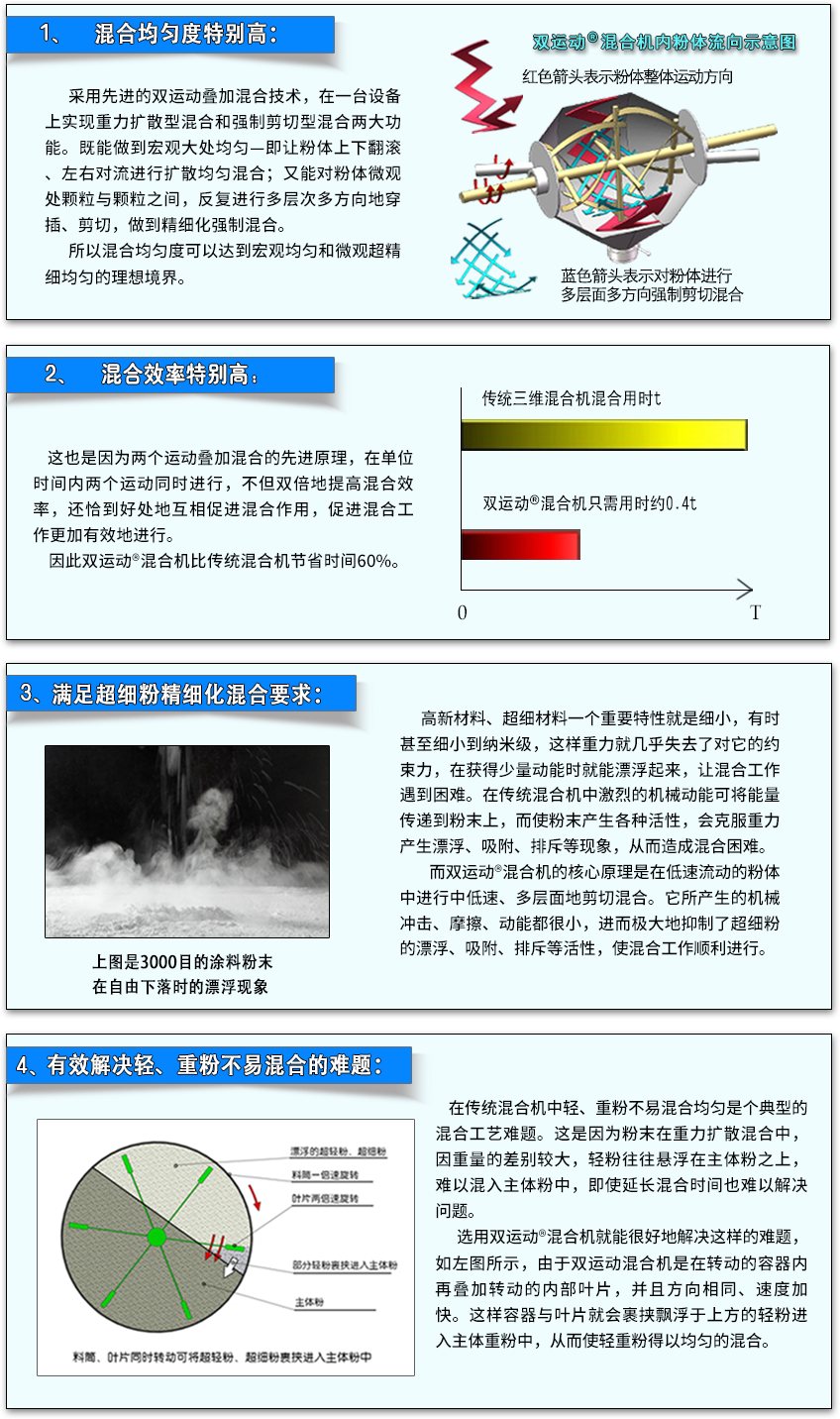 這也是因為兩個運動疊加混合的先進原理,在單位時間內兩個運動同時進行,不但雙倍地提高混合效率,還恰到好處地互相促進混合作用,促進混合工作更加有效地進行。因此雙運動混合機比傳統混合機節省時間60%。