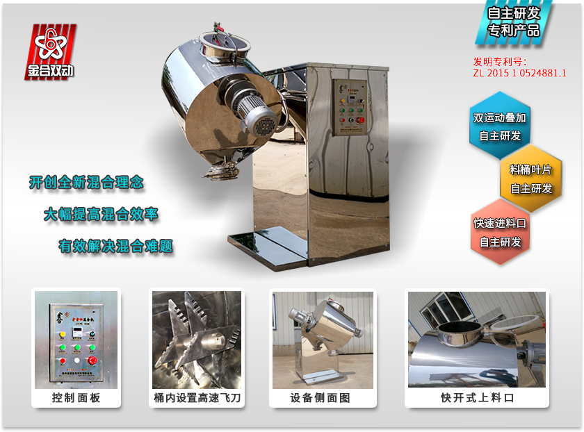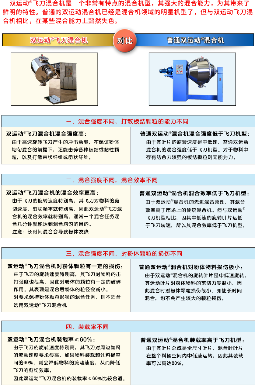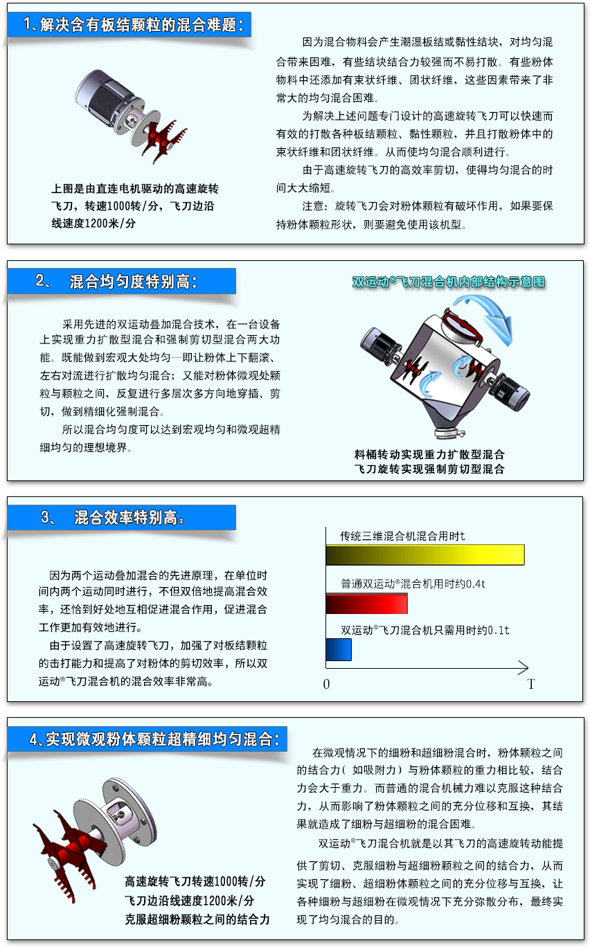 因為兩個運動疊加混合的先進(jìn)原理,在單位時間內(nèi)兩個運動同時進(jìn)行,不但雙倍地提高混合效率,還恰到好處地互相促進(jìn)混合作用,促進(jìn)混合工作更加有效地進(jìn)行。由于設(shè)置了高速旋轉(zhuǎn)飛刀,加強(qiáng)了對板結(jié)顆粒的擊打能力和提高了對粉體的剪切效率,所以雙運動?飛刀混合機(jī)的混合效率非常高。